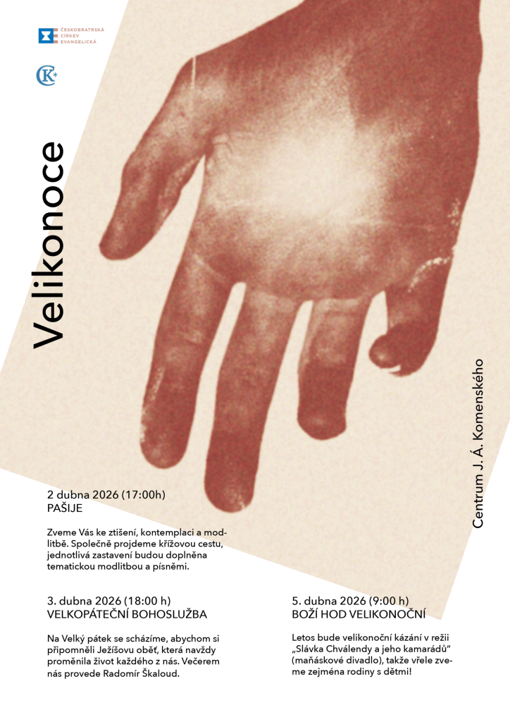 - 3. dubna 2026 (18:00) - VELKOPÁTEČNÍ BOHOSLUŽBA: Na Velký pátek se scházíme, abychom si připomněli Ježíšovu oběť, která navždy proměnila život každého z nás. Kázání bude mít Radomír Škaloud.